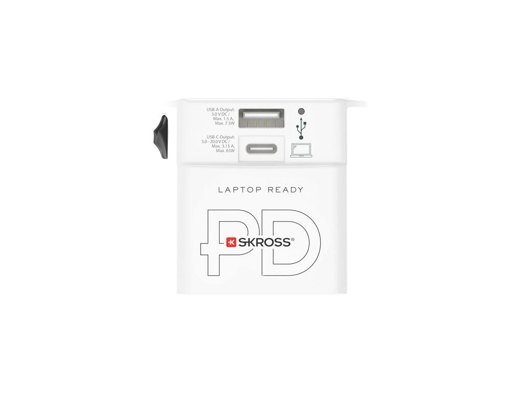 Pomocou SKROSS® World Adapter MUV USB AC65PD môžu cestovatelia z celého sveta súčasne nabíjať jedno USB-C zariadenie a jedno klasické USB zariadenie, pričom zároveň môžu pripojiť aj nepodpísané dvojpólové zariadenie.-Power Delivery (PD) technológia založená na obojsmernej komunikácii: nabíjačka a nabíjané zariadenie spoločne určujú najlepší spôsob nabíjania