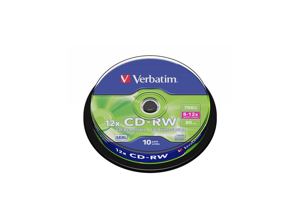 CD-RW disk, prepisovateľný, SERL, 700MB, 8-10x, 10 ks, cake box, VERBATIM