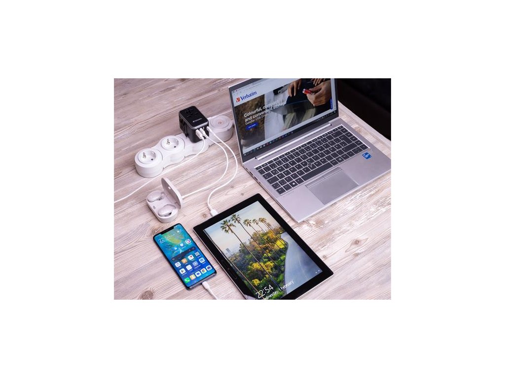 Univerzálny cestovný adaptér Verbatim je možné používať vo viac ako 180 krajinách: možno ho pripojiť k akémukoľvek miestnemu zdroju napájania na svete a dobíjať zariadenia náročné na energiu, ako sú notebooky a batérie do fotoaparátov. Porty USB-C a USB-A na spodnej strane môžete použiť na nabíjanie akéhokoľvek zariadenia USB. - kompaktný a bezpečný: certifikované FCC, UKCA, CE a ROHS - vyrobený z vysoko kvalitného ohňovzdorného polykarbonátového materiálu - má detské bezpečnostné poistky (možno otvoriť silou minimálne 75 N (7,5 kg) na otvor) - typy konektorov akceptované adaptérom: Typ A, B, C, E, F, G, I, J, L, N - Upozorňujeme, že nasledujúce zástrčky nie sú kompatibilné: Typ D, Typ H, Typ K, Typ M, Typ O -zásuvky, ku ktorým je možné pripojiť cestovný adaptér: Typ A, B, C, D, E, F, G, H, I, J, K, L, M, N, O - podporuje PD 20W a QC 3.0 rýchle nabíjanie -formáty konektorov: EU, UK, USA/Japonsko, AUS -1 x USB-C napájanie 61 W a Quick Charge 3.0 výstup: 18 W -1 x USB-C výstup: max. 12W - 3 x výstup USB-A: max. 12W -nabíjanie 6 zariadení súčasne -kvalifikovaná poistka + náhradná poistka -AC vstup: 100V-250V, 50/60Hz -menovitý výkon: 100-250 Vac 10A Max, 2500W Max -USB-C1 PD/QC: 5,0 V 3 , 0 A 15,0 W, 9,0 V 3,0 A 27,0 W, 12,0 V 3,0 A 36,0 W, 15,0 V 3,0 A 45,0 W, 20,3 V 3,0 A 61,0 W -USB-C2: 5,0 V 2,0 W A1/2 V 2,0 /3: 5,0 V 2,4 A 12,0 W -poistka: kompatibilná s BS1362 - NIE JE menič napätia - len na vnútorné použitie - 2-ročná obmedzená doživotná zárukaDodatočné parametre