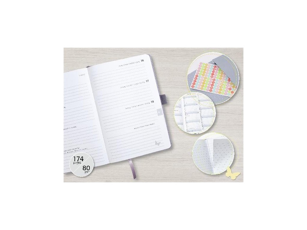 -týždenné rozvrhnutie (2 strany = 1 týždeň) -mesačný a ročný plánovač na roky 2026/2027 -s plánovačom narodenín a darčekov -s mapou sveta -so zoznamom úloh -s nálepkami "ikonky"