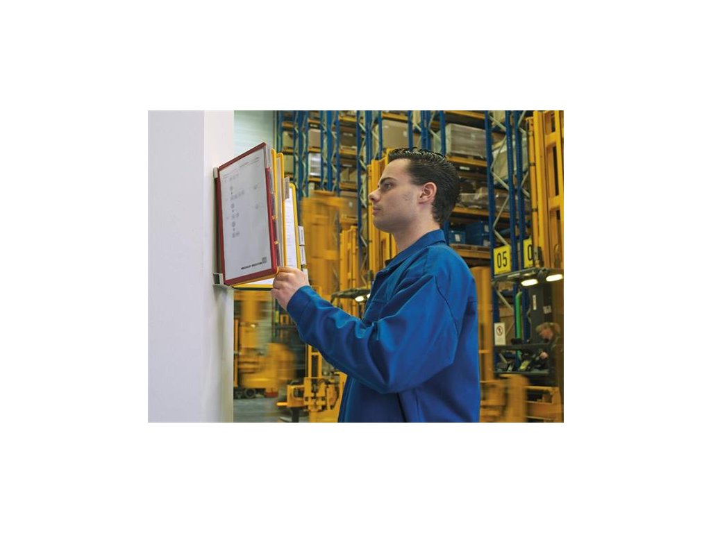 Nástenný držiak na prezentačné tabule so 20 ks A4 veľkosti SHERPA® panelov: 5 ks červených, žltých, zelených a tmavomodrých panelov.
