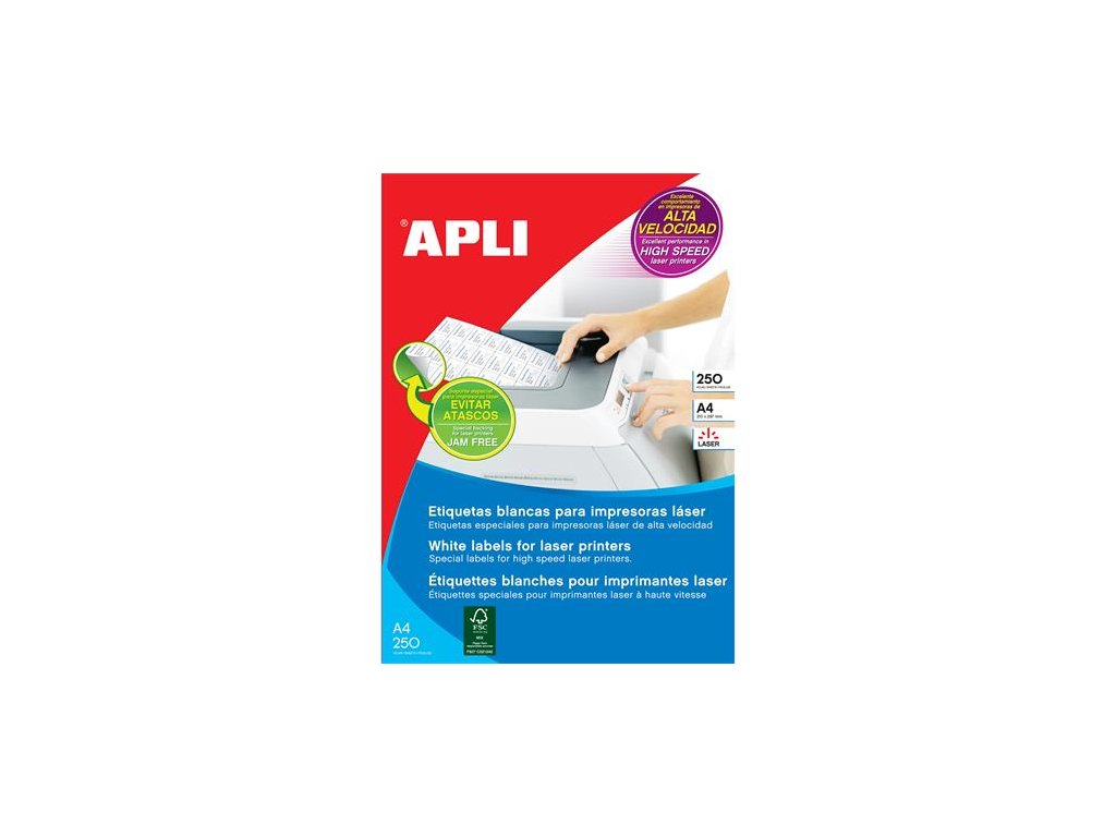 pre vysokorýchlostnú laserovú tlač zadarmo stiahnuteľný softver APLI Soft na tvorbu etikiet: www.apli.com certifikované PEFC, vyhovuje požiadavkám medzinárodného lesného hospodárenia 250 listov/balDodatočné parametre