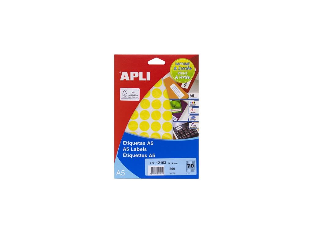 Etikety, okrúhle, priemer: 19 mm, farebné, na liste formátu A5, APLI, žlté, 560 etikiet/bal