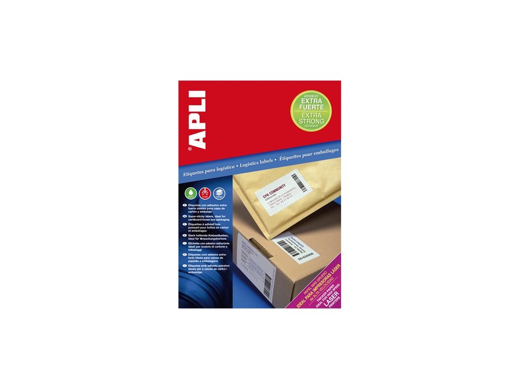 vhodné pre laserové, atramentové tlačiarne a kopírovacie stroje extra silne lepiace etikety, vhodné na hrubý, deravý a špinavý povrch dobre sa prilepí aj na takých miestach, kde sa bežné etikety nedajú použiť najlepšie riešenie na kartóny, zafóliované povrchy alebo iné logistické ciele bezplatne stiahnuteľný softver APLI Soft na tvorbu etikiet: www.apli.com 100 listov/balDodatočné parametre