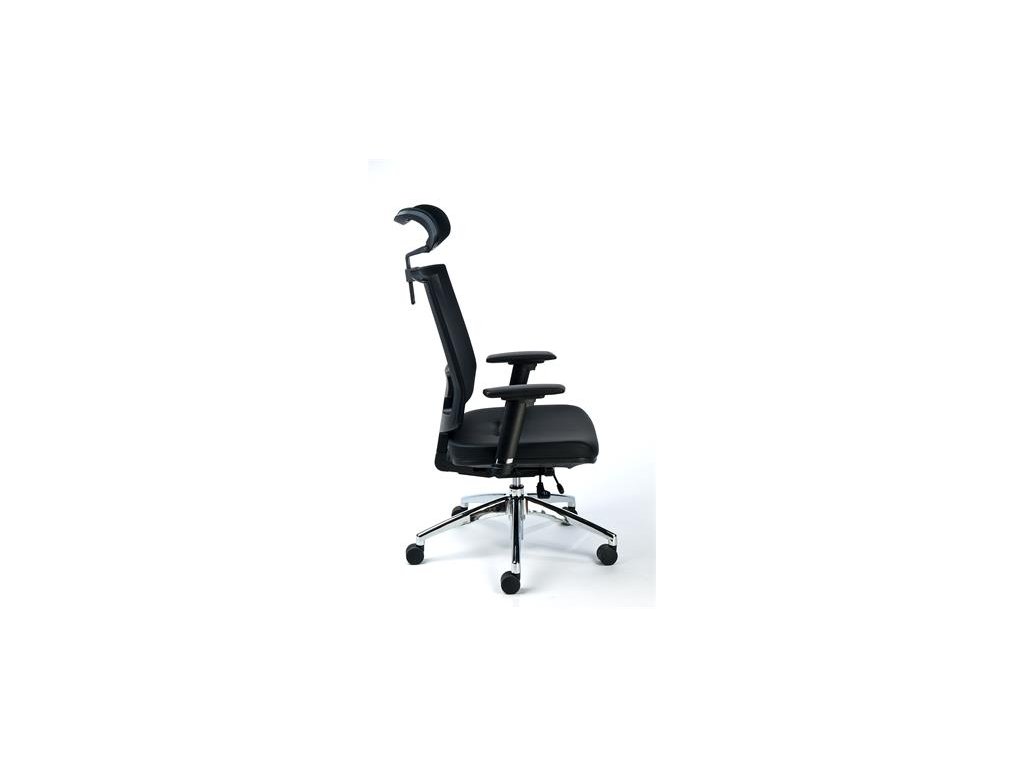 kancelárska stolička s vysokým operadlom komfortné vyhotovenie, ergonomicky tvarované operadlo plynové nastavenie výšky nastaviteľná hĺbka sedadla jedným pohybom nastaviteľná výška operadla hliníkový podstavec v štyroch bodoch nastaviteľná synchrónna mechanika sa prispôsobuje hmotnosti čalúnenie: operadlo: napnutý sieťový materiál sedadlo: mäkká bonded koža s nastaviteľnými opierkami rúk max. nosnosť: 130 kgDodatočné parametre