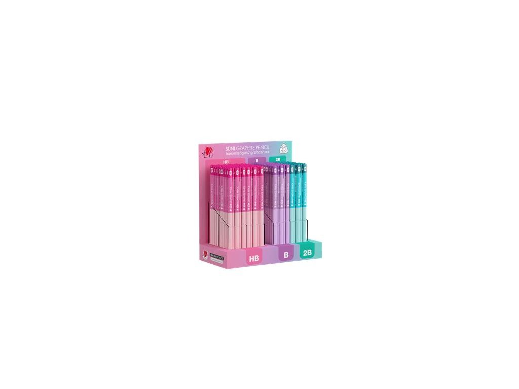 obsah displeja: 92 ks pastelovo ružových HB, 46 ks pastelovo fialových B, 46 ks mentolovo zelených 2B grafitových ceruziek