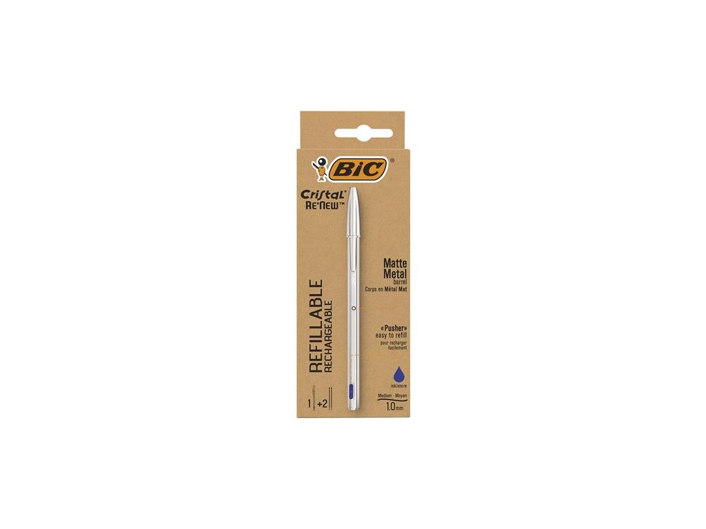 Guľôčkové pero, 0,32 mm, s vrchnákom, matné strieborné telo pera, BIC "Cristal Re`New", modré + náplň
