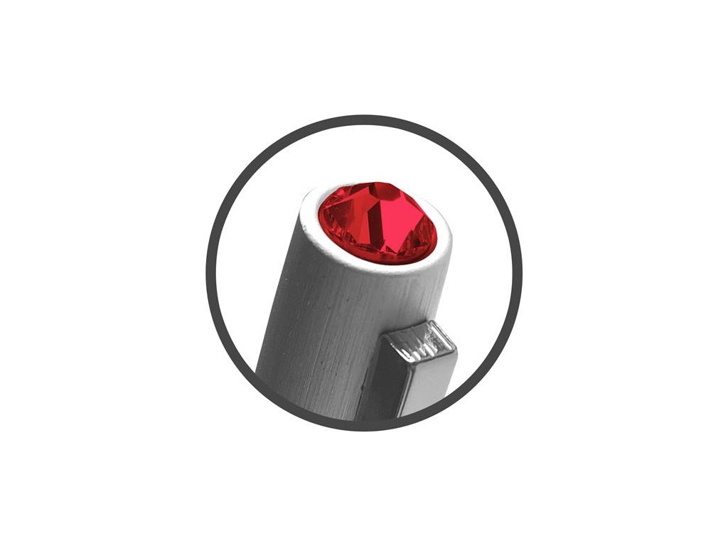 - guľôčkové pero s moderným dizajnom, ozdobené s originálnym krištáľom SWAROVSKI® - elegantné, trendové vyhotovenie - kovové telo pera je gravírovateľná - farba tela: strieborná - farba krištáľu: light siam červená - farba náplne: modrá - hrúbka písma: 0,7mm - v čiernej zamatovej krabičkeDodatočné parametre