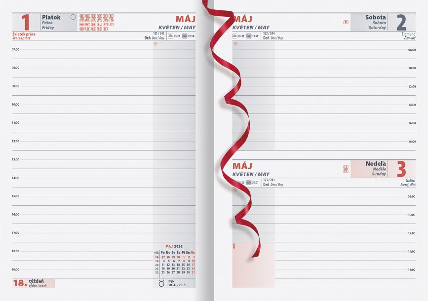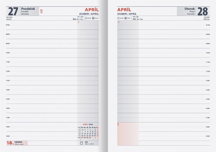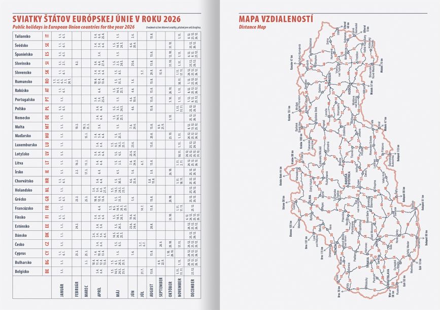Denný diár v pestrej farebnej škále, s listami z krémového papiera, s bohatým obsahom. Kvalitný diár s hodinovým delením obsahuje slovenské a české kalendárium, anglický preklad mesiacov a dní, informácie o štátnych sviatkoch susediacich krajín EÚ, prehľadný a plánovací kalendár, školské prázdniny, prehľad dôležitých inštitúcií, adresár. Ponúka dostatočný priestor pre písanie poznámok a pripomienok.