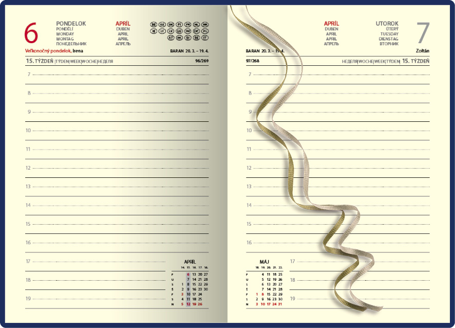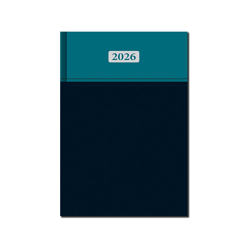 Zaujímavý dizajn denného diára tvorí kombinácia dvoch farieb poťahového materiálu. Farebná kovová nálepka roku, ozdobné kontrastné prešitie. Predná doska penová. Slovenské prehľadné kalendárium. Rozmer:142x204mm