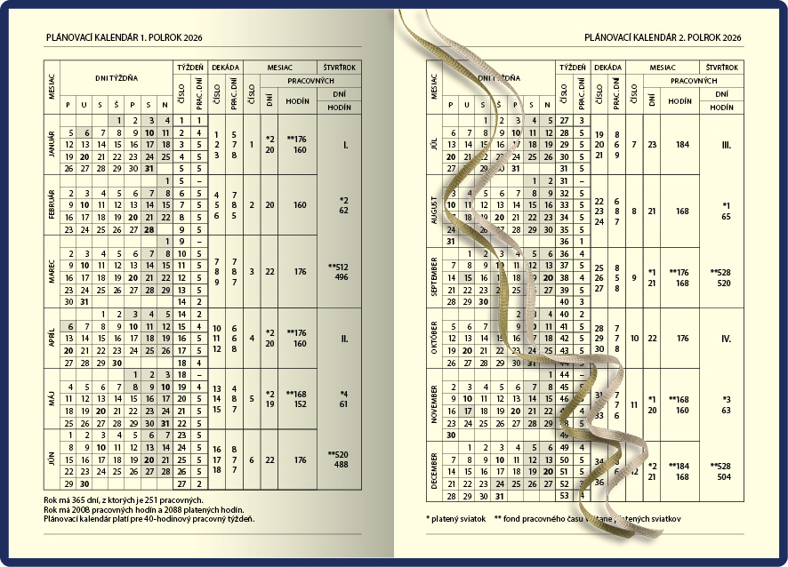 Luxusný denný diár z ekologickej kože s prehľadným kalendáriom na každý deň. Diár je v pevnej väzbe s prednou aj zadnou penovou doskou, doplnený ozdobným prešitím po obvode diára, strieborným plieškom s rokom a dvoma lacetkami. Obsahuje slovenské kalendárium. Rozmer: 142x204mm