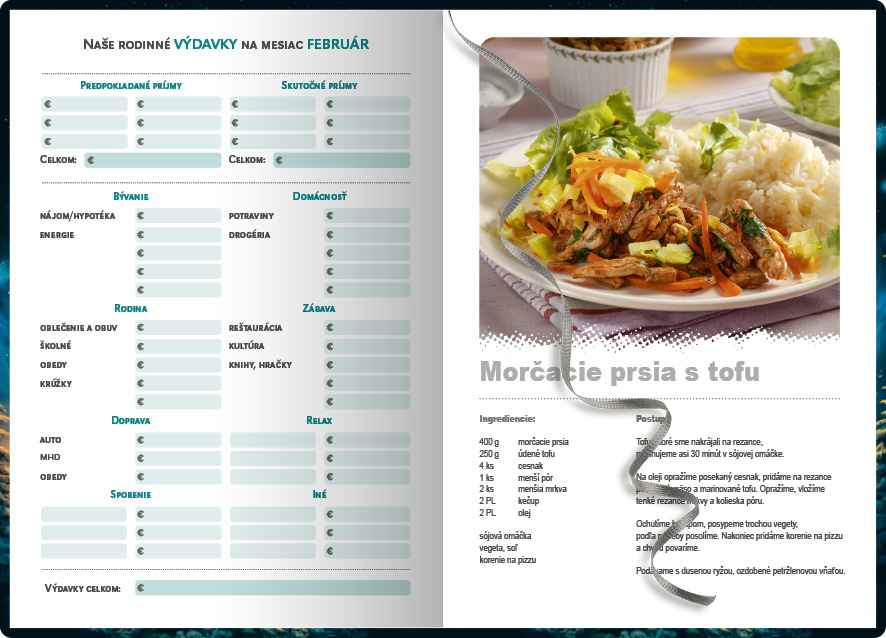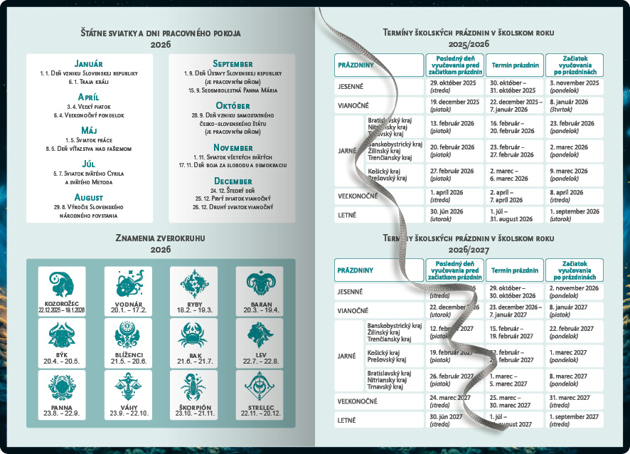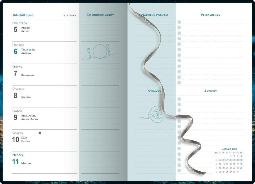 Tento prehľadný týždenný rodinný diár je praktický pomocník pre celú rodinu. Je navrhnutý tak, aby pomohol lepšie organizovať každodenný rodinný život. Umožňuje plánovať spoločné aktivity, výlety, dovolenky, pracovné povinnosti a tiež si môžete naplánovať jedálny lístok na celý týždeň. Obsahuje rozvrh hodín, chutné recepty, prehľad aktivít. Obal diára je v tvrdých doskách so soft touch laminom, medenou razbou. Všetky bočné plochy diára sú potlačené farebne.