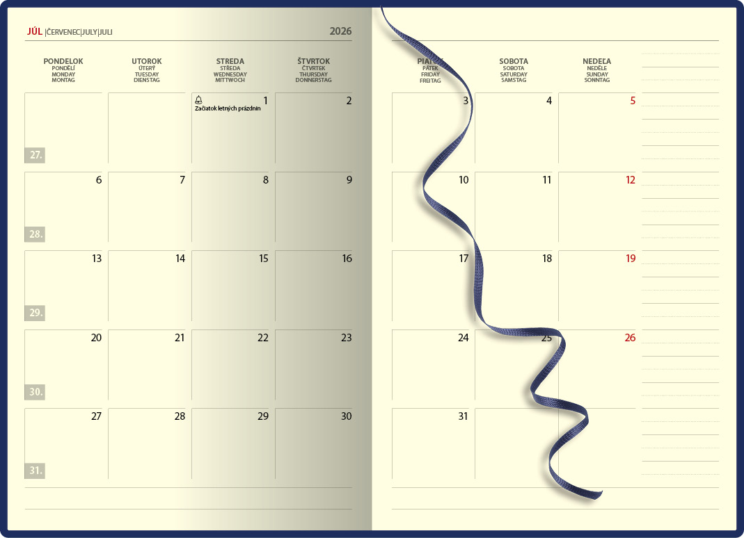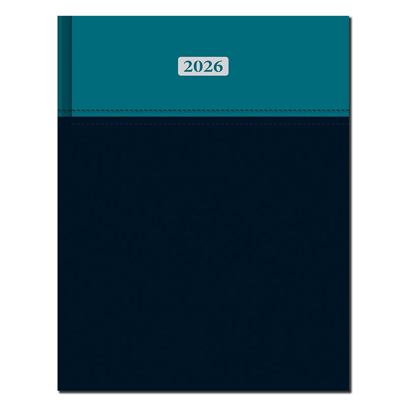 Zaujímavý dizajn týždenného diára tvorí kombinácia dvoch farieb poťahového materiálu. Farebná kovová nálepka roku, ozdobné kontrastné prešitie. Predná doska penová. Slovenské prehľadné kalendárium. Rozmer: 202x260mm