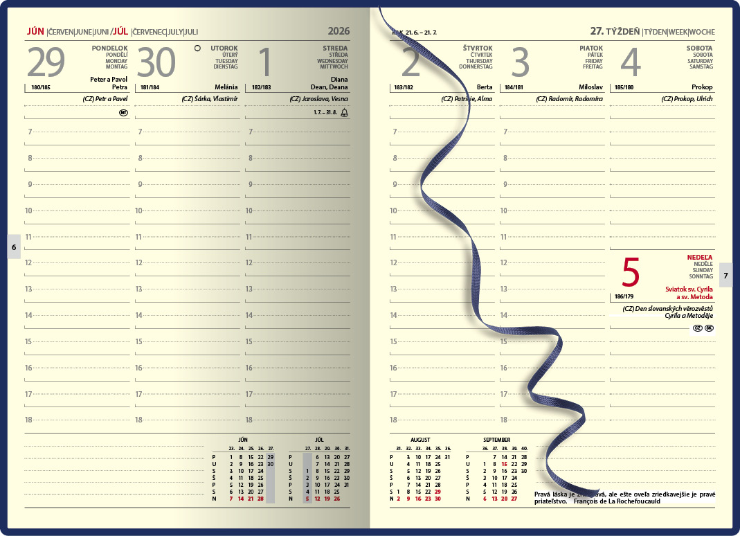 Manažérsky týždenný diár s prehľadným kalendáriom na každý týdeň. Diár je v pevnej väzbe s prednou penovou doskou, jednoduchý dizajn dopĺňa strieborná razba roku. Obsahuje slovenské kalendárium. Značka: 170 x 240 mm