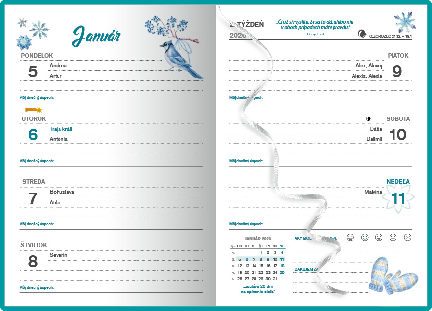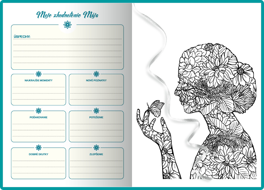 Obľúbený diár s graficky prepracovaným týždenným kalendáriom Vám spríjemní každý týždeň novým mottom. Každý mesic nájdete súhrn svojich cieľov či myšlienok, ku ktorým Vás nabudia motivačné texty na začiatku každého mesiaca. Počas voľných chvíľ si môžete vymaľovať tematické antistresové omaľovánky. Dizajn obálky diára je prepracovanáý použitím razby a 3D laku. Vhodný ako darček. Rozmer: 142 x 204 mm