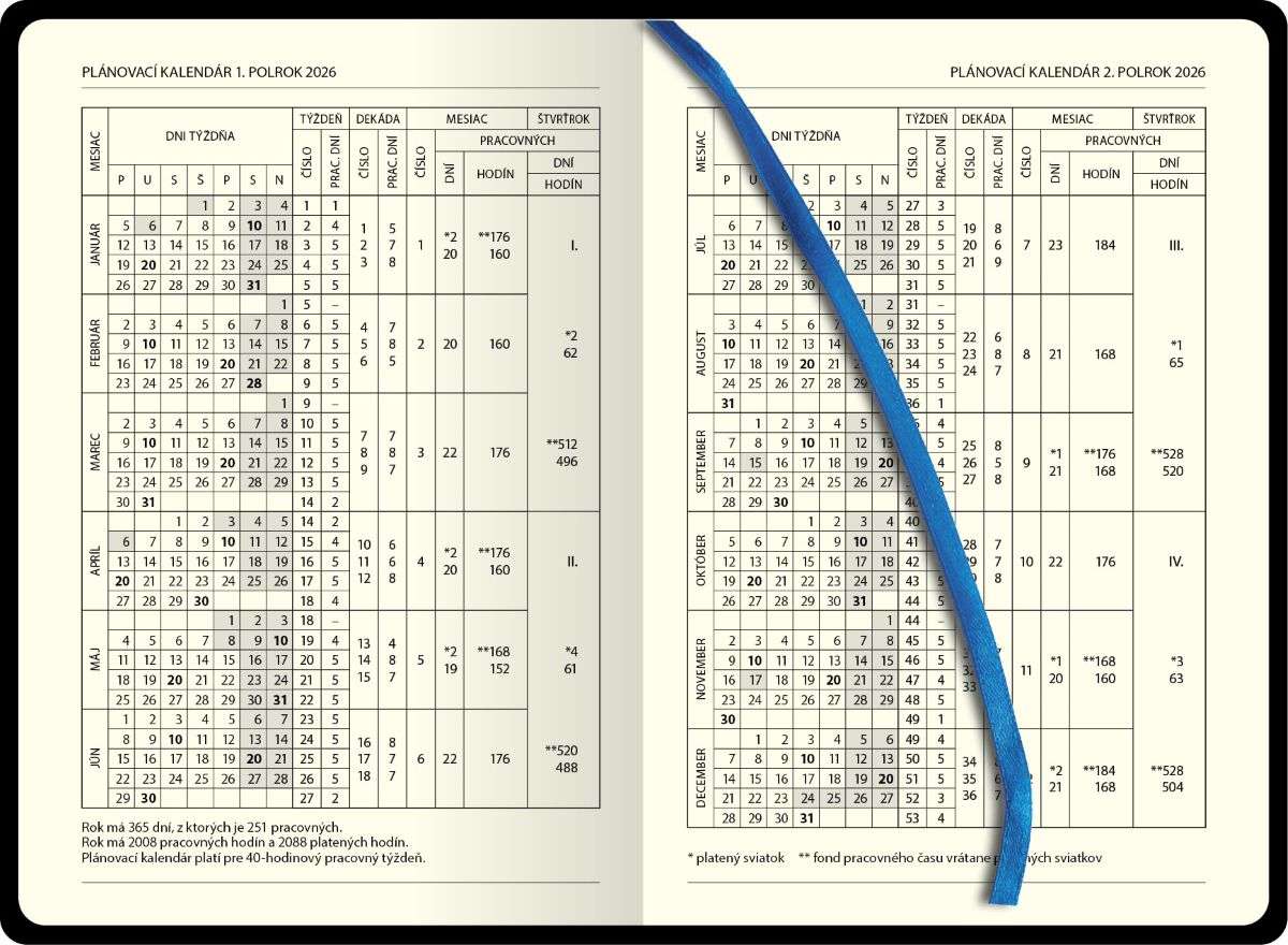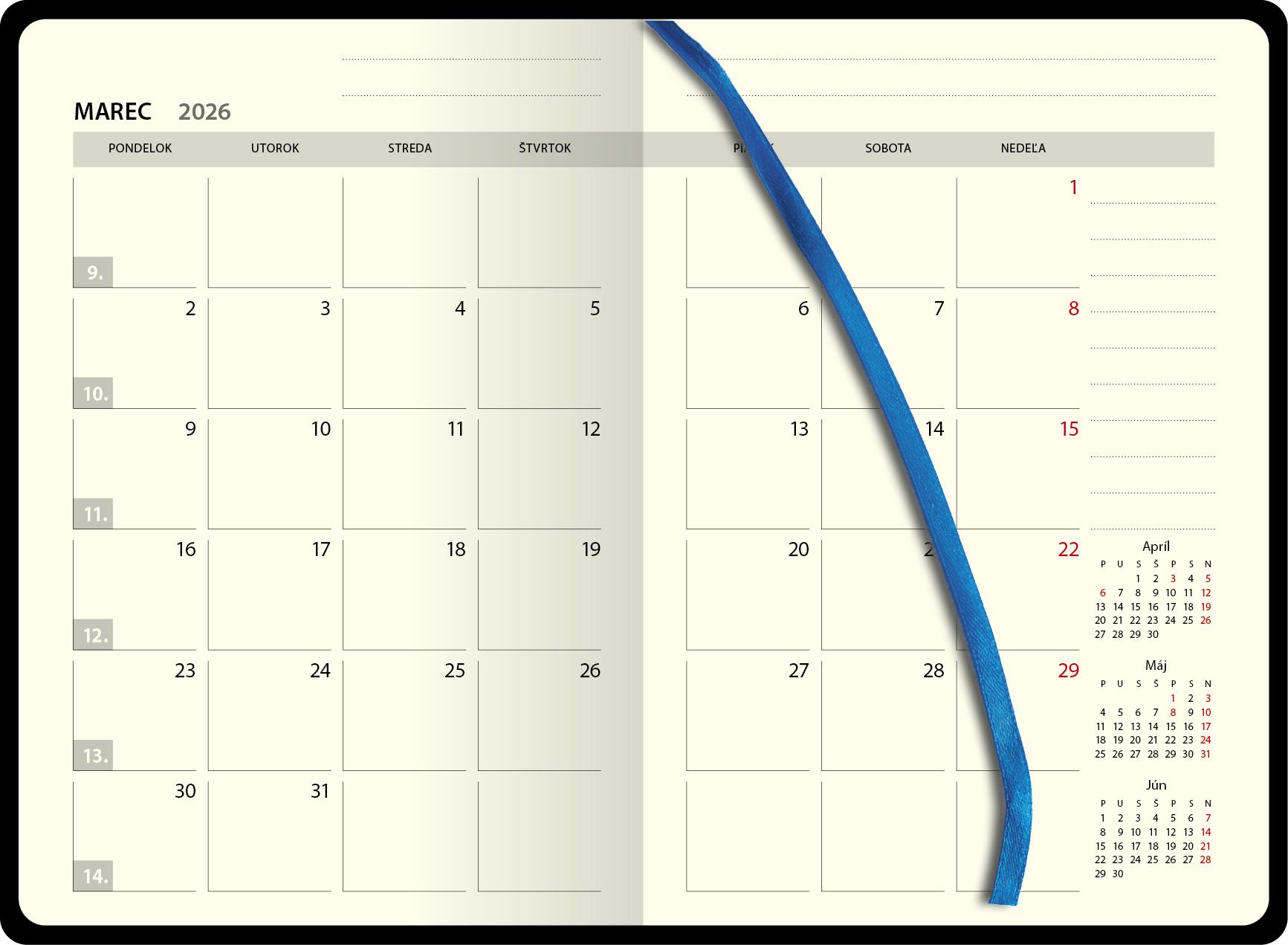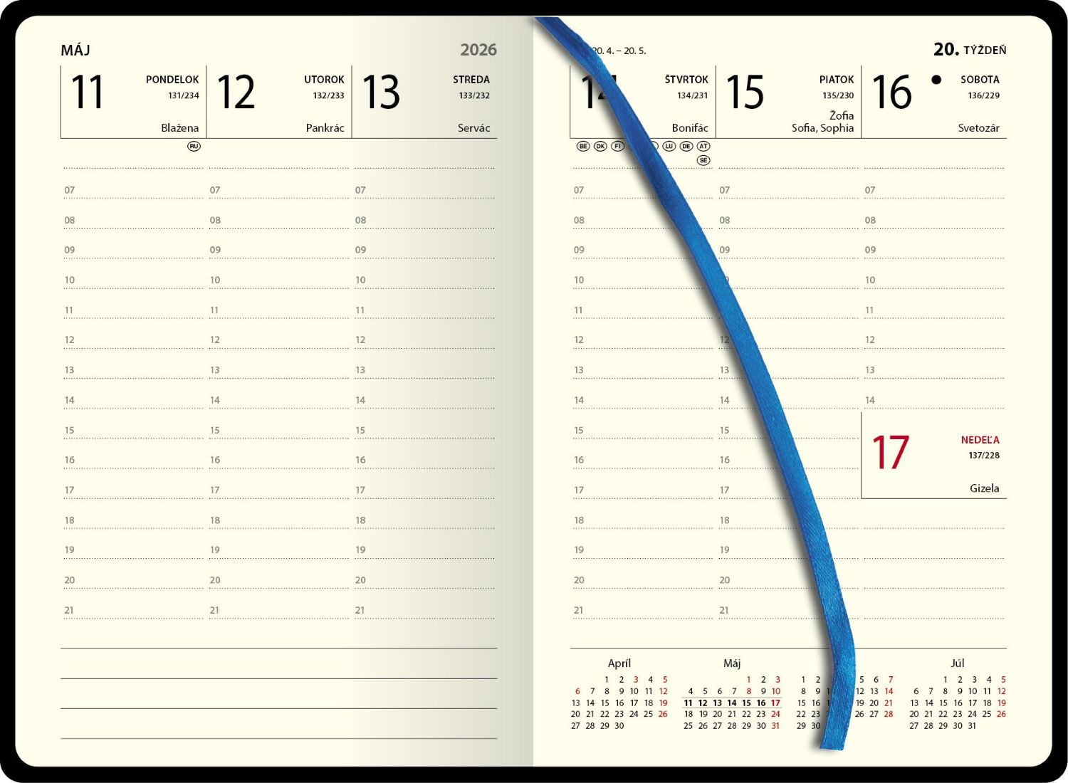Týždenný stĺpcový diár s prehľadným kalendáriom na každý týždeň s pútkom a vloženým perom, gumičkou na uzatváranie a praktickým vreckom. Diár je v pevnej väzbe z ekologickej kože s prešitím a so živicovým rokom. Obsahuje slovenské kalendárium. Rozmer: 138x205mm