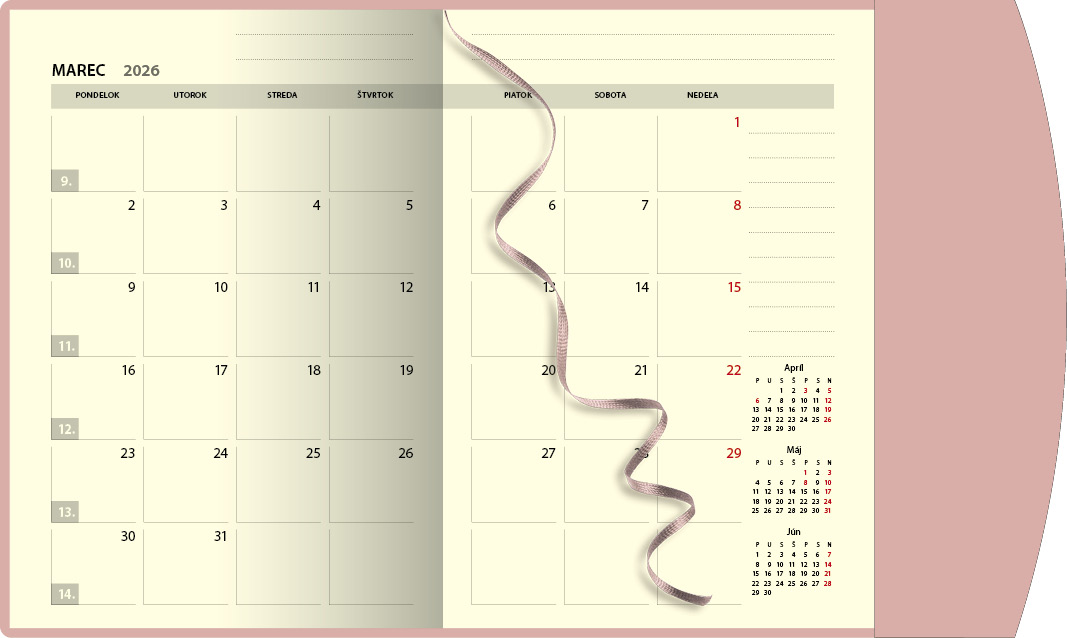 Týždenný stĺpcový diár z ekologickej kože doplnený ozdobným prešitím, razba roka cez fóliu, magnetické zatváranie. Rozmer: 142x204mm