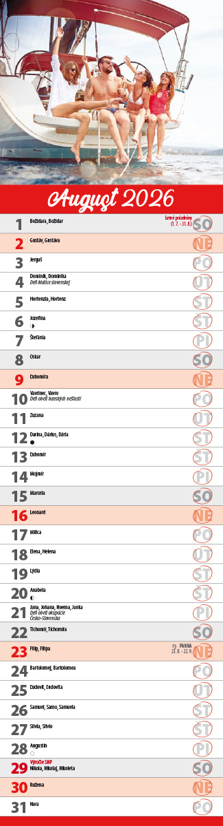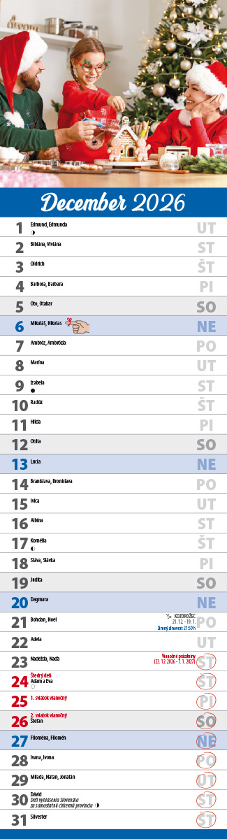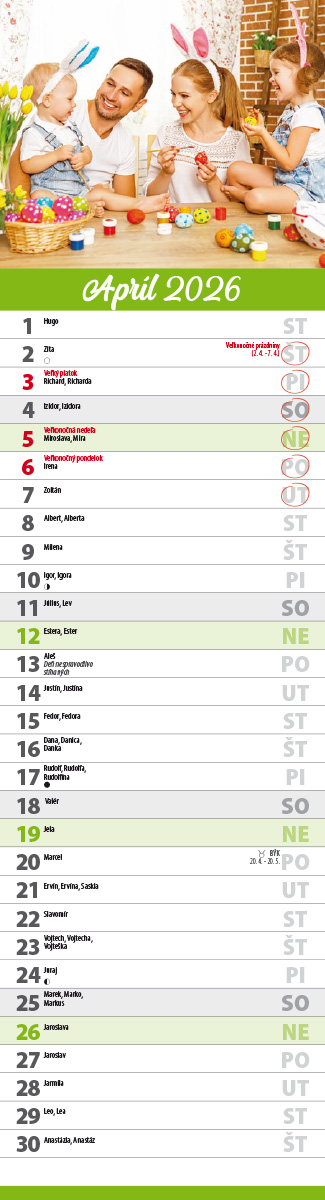 Nástenný kalendár RODINNÝ.  Hmotnosť 0,08 kg Formát: 115 x 425 mm. Vario špirála, natieraný lesklý papier, 7 listov. Cena za 1 ks výrobku. Rodinný kalendár pre zábudlivcov s pripomienkami najvýznamnejších sviatkov týkajúcich sa rodiny. Obsahuje prehľadné mesačné kalendárium so slovenskými menami, štátnymi sviatkami, pamätnými dňami, znamenia zverokruhu a fázami Mesiaca. V kalendári sú vyznačené školské prázdniny. Objednávky už od 1 ks. Možnosť potlače na presah podložky (115 x 40 mm). Balenie po 20 ks.