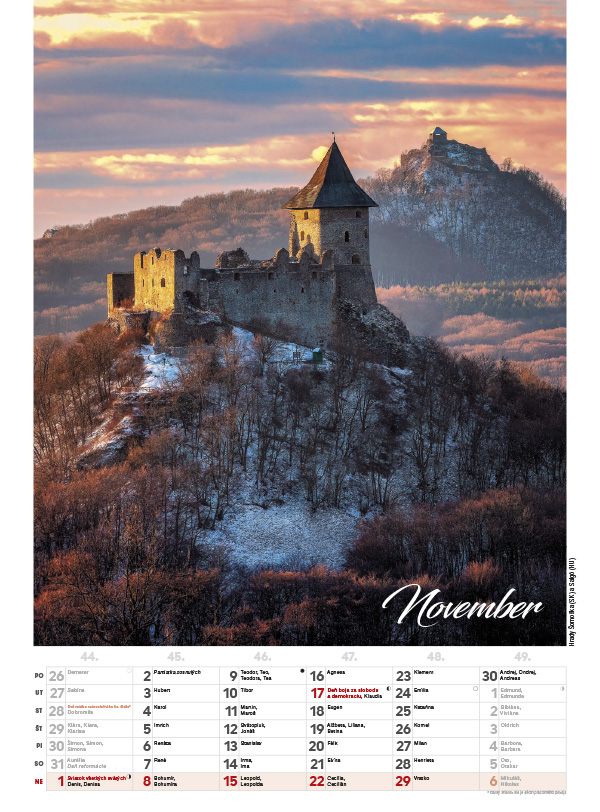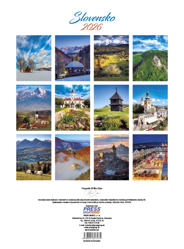 Elegantný nástenný kalendár približuje krásu a jedinečnosť slovenskej krajiny. Kalendár má mesačné kalendárium a slovenské, české mená a štátne sviatky oboch krajín.
