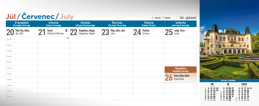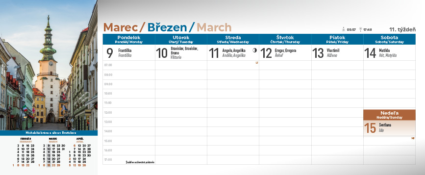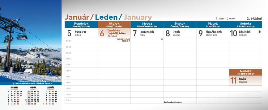 Spoznajte krásy Slovenska prostredníctvom stolového kalendára Slovensko. Týždňový kalendár s hodinovým delením, daňovými pripomienkami, mesačnými kalendáriami, fázami Mesiaca, východmi, západmi Slnka, štátnymi sviatkami susediacich krajín EÚ, školskými prázdninami, slovenskými a českými menami (plus netradičné mená).