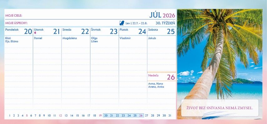 Tento stolový kalendár Vám bude prinášať pozitívne myšlienky v priebehu celého roka. Každý týždeň si určíte svoj cieľ a vyhodnotíte dosiahnuté úspechy. Obsahuje samolepky, ktorými si užitočne a vtipne doplníte svoju činnosť a pocity. Rozmer: 297 x 138 mm