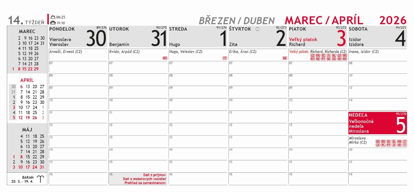 Praktický plánovací kalendár s prehľadom najbližších mesiacov na ľavej strane. Dostatok miesta na plánovanie celého týždňa. Rozmer: 297 x 138 mm