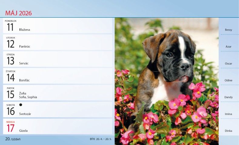 Praktický menší formát stolového riadkového kalendára pre všetkých milovníkov najlepších štvornohých priateľov, doplnené psími menami. Značka: 230 x 140 mm