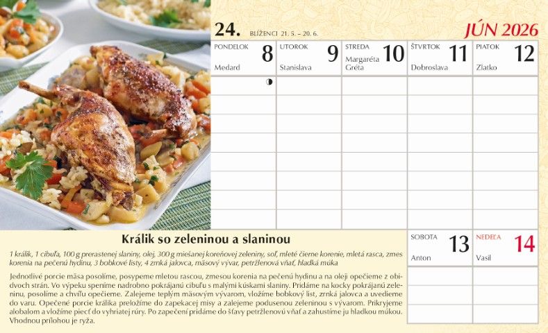 Praktický formát kalendára s klasickými receptami na každý týždeň. Tradičné slovenské recepty, ktorým neodoláte. Značka: 230 x 140 mm