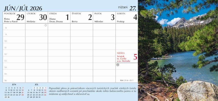 Stolový týždenný kalendár stĺpcový doplnený úchvatnými výhľadmi z tatranských kopcov, Vám ponúknu inšpirácie na turistiku. Sprievodný text Vám poskytne zaujímavé informácie z významných tatranských miest. Rozmer: 297 x 138 mm