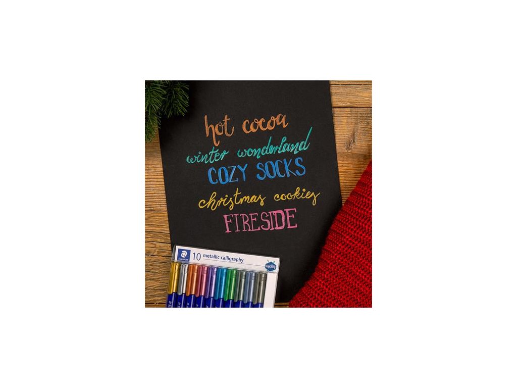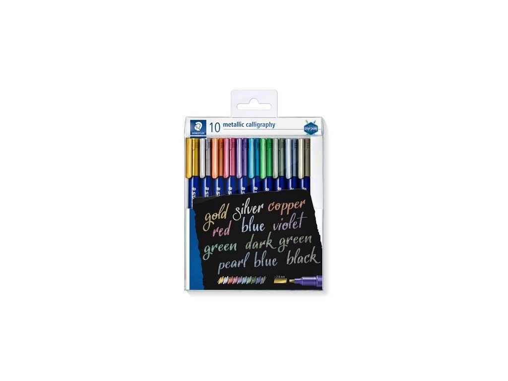 Metalové kaligrafické popisovače na písanie na svetlý a tmavý farebný papier, kartón, dekoratér. - ideálne na výrobu albumov a pohľadníc - pred použitím nie je potrebné pretrepávať a tlačiť - na hladkých povrchoch, napr. sa dajú ľahko odstrániť zo skla a zrkadiel vlhkou handričkou - hrúbka čiary: 2,8 mm - s kaligrafickou špičkou - Sada 10 rôznych metalických farieb Značka: STAEDTLER Výrobca: STAEDTLER SE Adresa: Moosäckerstr. 3 , 90427 Nuremberg, Germany Web: http://www.staedtler.com Email: https://www.staedtler.com/intl/en/service/contact/Dodatočné parametre
