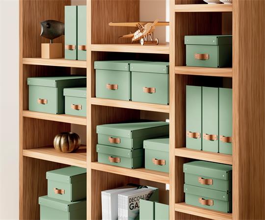 Štýlová kožená rukoväť uľahčuje vyberanie kartónových úložných boxov z políc, úložných či šatníkov.