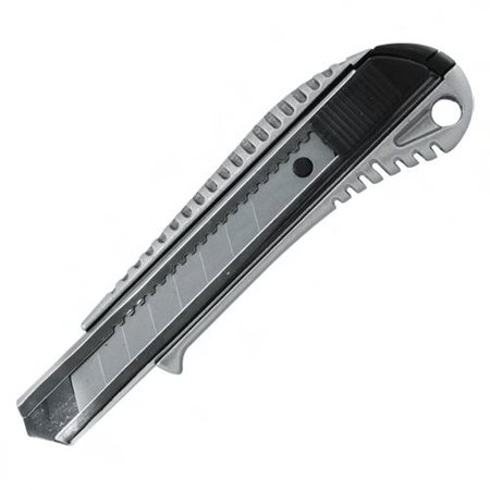 Nôž orezávací kovový,s odlamovacou čepeľou,vysúvané pomocou polohovacieho jazdca so zarážkami šírka čepele 18 mm. Dodávané na blistri. Rozmer: 155x40x10mm.