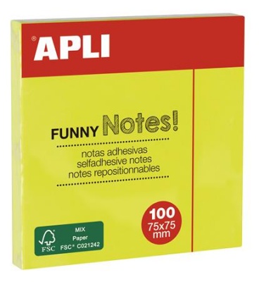 Samolepiaci bloček, 75x75 mm, 100 listov, APLI, neónový žltý