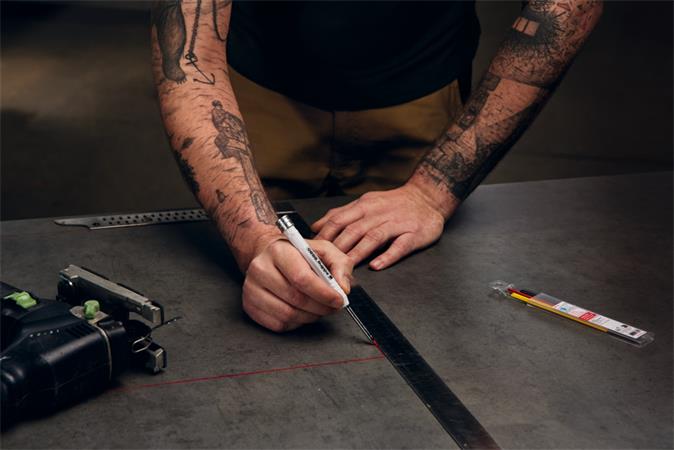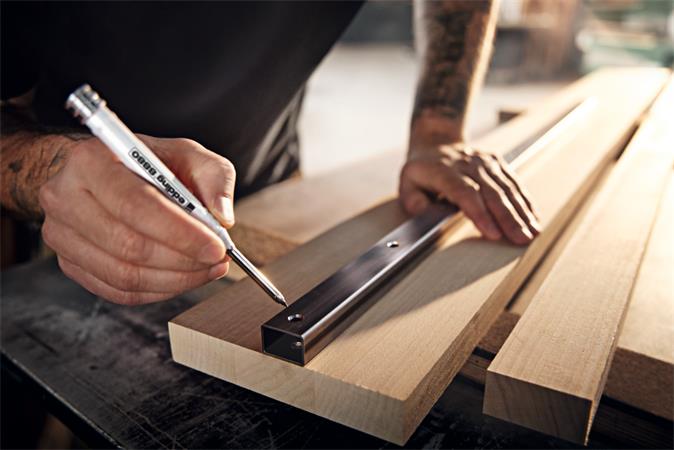 Popisovač na značenie otvorov v praktickom puzdre, pre presné značenie na takmer akýkoľvek materiál, ako napr drevo, kov, plast, dlaždice a lepenka.
