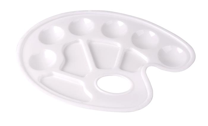 -plastová paleta na miešanie farieb - vďaka otvoru na palec sa veľmi dobre drží - paleta obsahuje 10 kalíškou na farby -s hrubým okrajom na zamedzenie odkvapkávania -rozmer: 22 x 16,5 cm - celofánové balenie s držiakom
