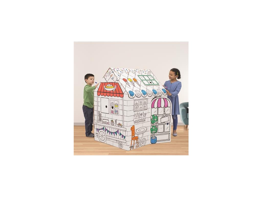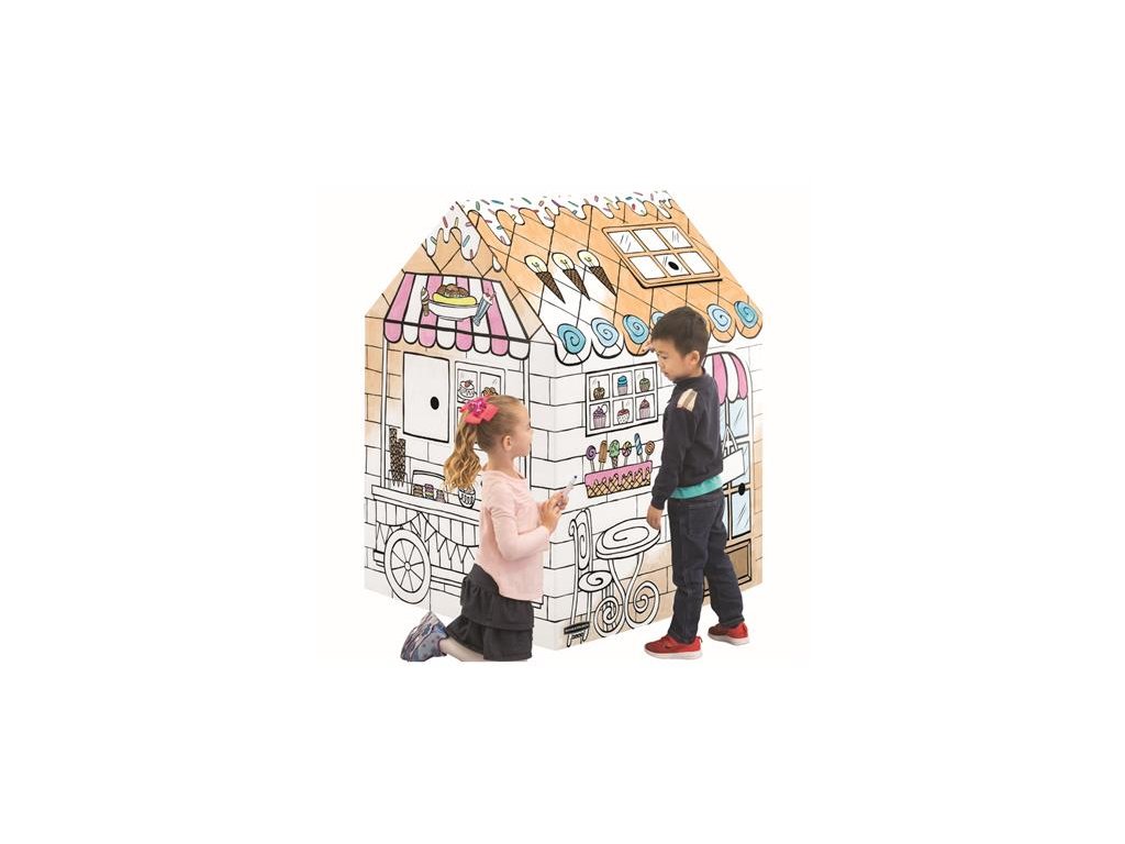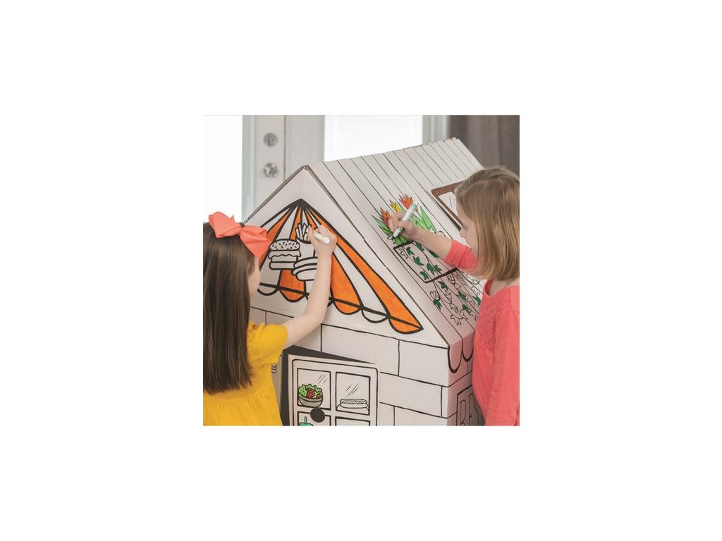 Kreatívny domček pre deti odolný kartón so zaoblenými rohmi možnosť vyfarbenia fixkami, ceruzkami alebo vodovými farbami (nie sú súčasťou balenia) otvárateľné dvere a okná vyhovuje normám CE a UKCA pre deti nad 3 rokov ľahká montáž v 2 krokoch, bez použitia lepidla 2 rôzne vzory, vzor sa nedá vybrať rozmery v zloženom stave: 121,3 x 96,5 x 81,3 cm (výška x šírka x hĺbka)Dodatočné parametre