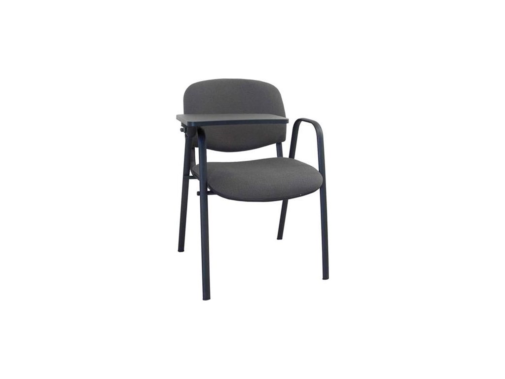Čierna stolička s oceľovým rámom a opierkami na ruky, s vyklápacím plastovým stolíkom pre pravákov. Operadlo s 25 mm penou, sedadlo s 30 mm penou, panel operadla a sedadla z vrstvenej preglejky, plastový kryt sedadla. Stohovateľná.Záruka: 1 rok.