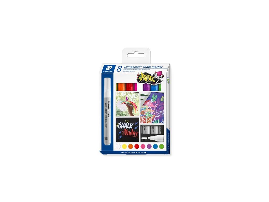 Kriedový popisovač, sada, 2,4 mm, kužeľový hrot, STAEDTLER "Lumocolor® 344", 8 rôznych farieb
