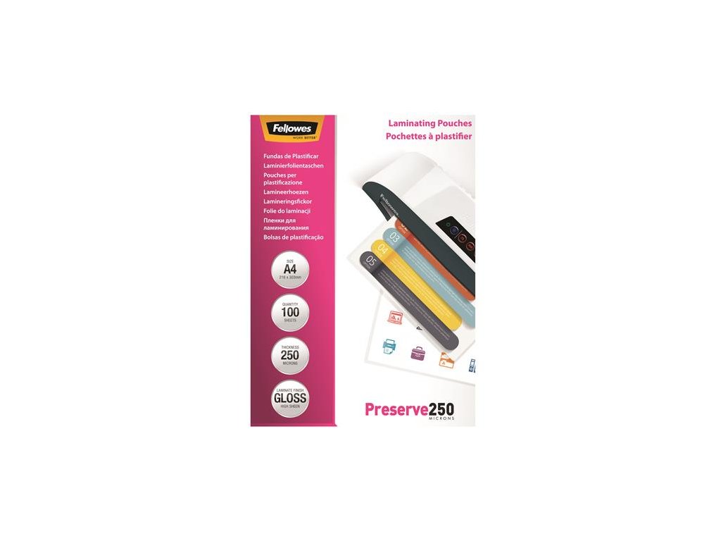 rozmer: A4 hrúbka: 250 mikrónov povrch: lesklý úroveň ochrany: najvyššia vhodné na lamináciu nápisov, fotografií, certifikátov, jedálnych lístkov, vonkajších nápisov ako aj v oblasti hobby a remesiel balenie: 100 ks/bal Pre dokonalé výsledky a vynikajúcu spoľahlivosť vždy používajte laminovacie fólie Fellowes® pre laminovacie stroje Fellowes®!Dodatočné parametre