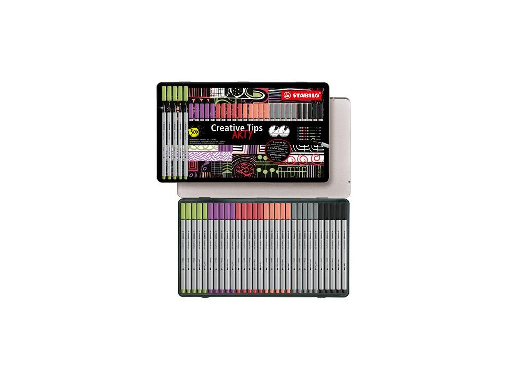 Liner, sada, v kovovej krabičke, STABILO "Creative Tips ARTY", 6 rôznych pastelových farieb, 5 rôznych hrúbok