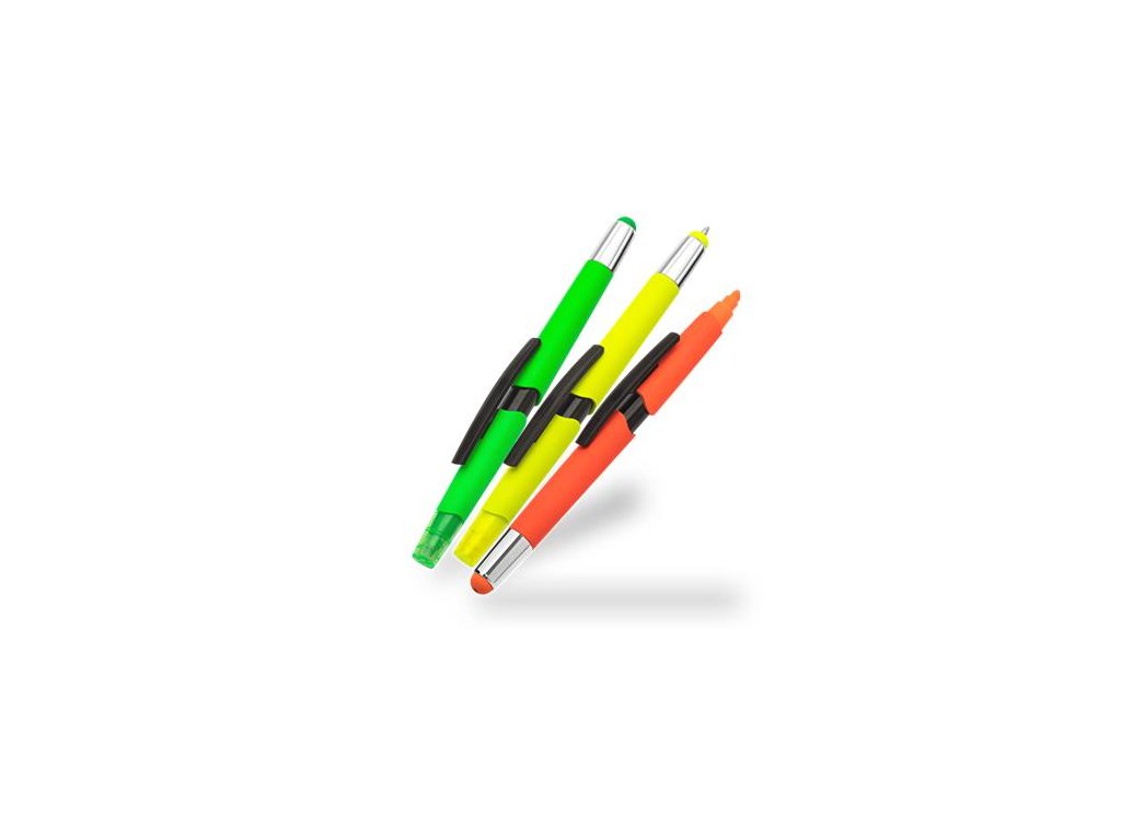 Multifunkčné pero! -1 telo viac funkcií -ideálne na dotykové displeje (koniec vrchnáku) -ideálne na písanie poznámok -ideálne na zvýraznenie podstatného obsahu -3 rôzne neónové farby (2 x neónovo žlté, 1 x neónovo zelené, 1 x neónovo oranžové) -farba atramentu guľôčkového pera: modrá -farba zvýrazňovača sa zhoduje s farbou tela pera -odolný klip -rozmery: 14 x 1,7 cmDodatočné parametre
