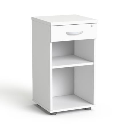 Úložný prvok má výšku rovnakú ako písacie stoly, s jednou drevenou zásuvkou a jednou poličkou.