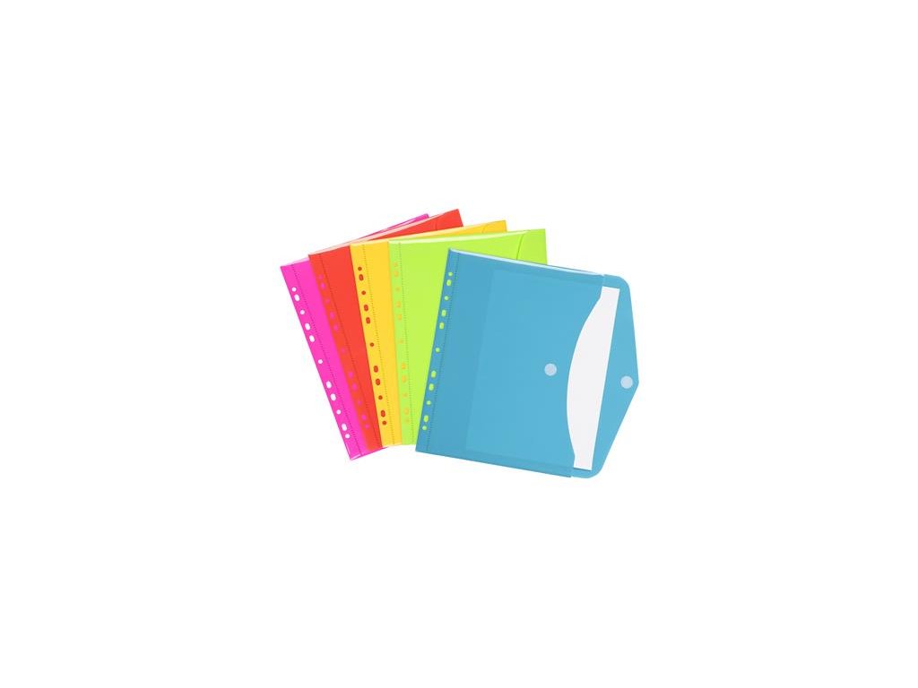 Farebné obaly na dokumenty! -formát: A4 -rozmery: 31,5 x 24 cm -ľahko sa zatvára pomocou patentu -materiál: lesklý PP -mix farieb, farba sa nedá vybrať (modrá - zelená - žltá - červená - ružová)Značka: VIQUEL
