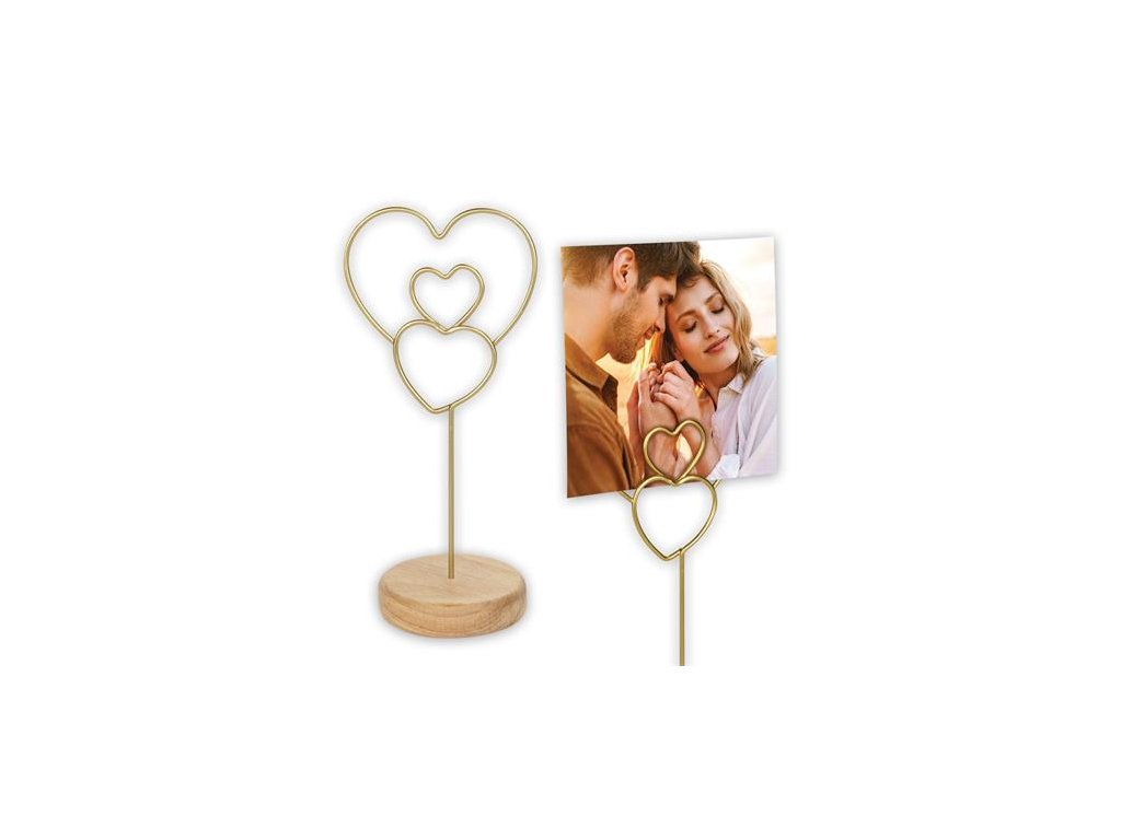 Kovový štipec na fotografie v tvare srdca, stolový dizajn, s nastaviteľným riešením nohy. Fotografiu je možné umiestniť do rámu vertikálne alebo horizontálne. Rozmer fotografie: 6x16 cm Farba: zlatá Materiál: kovový rám, drevená základňa Značka: . Výrobca: Fotoplus Kft Adresa: 7623 Pécs, Megyeri út 59., Hungary Web: https://www.fotoplus.hu/ Email: fotoplus@fotoplus.hu rendeles@fotoplus.huDodatočné parametre