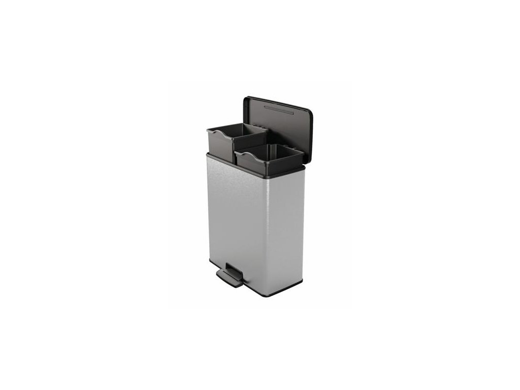 Deco Bin Duo je dvojkomorový kôš s objemom 26 litrov na jednu priehradku, ktorý je ideálnou voľbou pre triedený zber odpadu. Mäkké veko bez zápachu a veľký pedál umožňujú mimoriadne pohodlné a hygienické používanie odpadkového koša. Deco Bin vyrobený zo 100% recyklovaného plastu je nielen ekologický, ale aj odolný, o čom svedčí aj 5-ročná záruka. Odpadkový kôš vďaka svojmu dizajnu a použitým materiálom nehrdzavie, neryje a nie sú na ňom viditeľné ani odtlačky prstov. - silný pedál - 2 vnútorné koše na selektívny zber odpadu - jemne zatváracie veko - vyrobené z ekologického, 100% recyklovaného plastu - jednoduché čistenie - 5-ročná záruka - rozmer: 284 x 486 x 615 mm - materiál: 100% recyklovaný plast - objem: 2x26 litrov - farba: striebornáDodatočné parametre