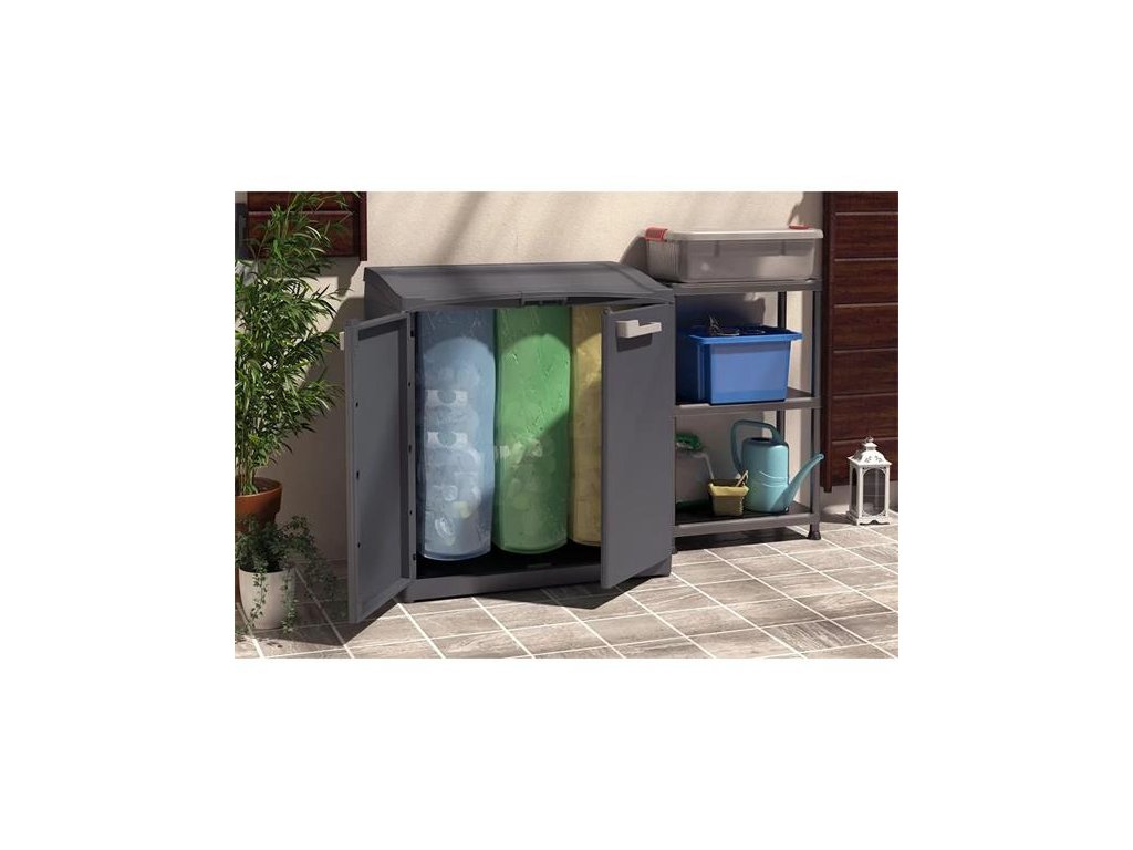 KETER Moby štýlovo a jednoducho prispieva k ochrane životného prostredia.Jeho moderný dizajn sa hodí do exteriéru. -vhodná na uloženie troch vriec s objemom do 110 litrov -vyrobený z polypropylénu -ľahko sa čistí - jednoduchá montáž -má jedno veľké horné veko s push-to-open systémom otvárania, ktorý umožňuje jeho otvorenie jediným pohybom. - predné dvojkrídlové dvierka s pohodlnými úchytkami - s nastaviteľnými nohami -rozmery: 55x90x100 cm (šírka x hĺbka x výška) -hmotnosť: 13,61 kg - vrecia nie sú súčasťou baleniaDodatočné parametre