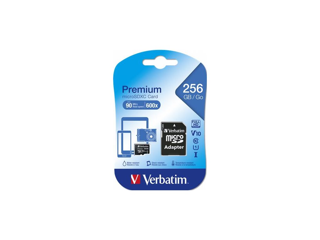 Kapacita: 256 GB Class 10 UHS-I Rýchlostná trieda UHS: U1 S adaptérom SD Rýchlosť zápisu: 10 MB / s Rýchlosť čítania: až 90 MB / s Verbatim 2-ročná obmedzená zárukaDodatočné parametre