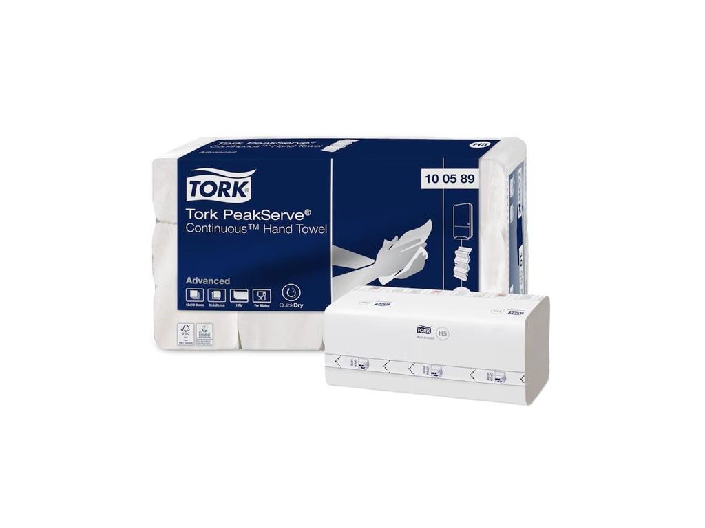 Doprajte svojim hosťom pohodlie s jemnými papierovými utierkami na ruky Tork PeakServe® Advanced. Zaistia dobré usušenie rúk a majú veľmi peknú sivú ozdobnú razbu v tvare listu. Tork PeakServe®: najnovšia inovácia navrhnutá pre vysoko frekventované toalety a umyvárne, kde personál potrebuje maximalizovať čas upratovania a udržať dobrú plynulosť pre návštevníkov. Systém je kompatibilný so zásobníkom Tork PeakServe. Má vysokú kapacitu vyše 2 100 utierok, ktoré dokáže dávkovať rýchlo a plynulo bez prerušenia. Stlačené náplne sa rýchlo kedykoľvek dopĺňajú. Ľahko sa uskladňujú a prepravujú, vďaka čomu umožňujú personálu sústrediť sa na upratovanie.