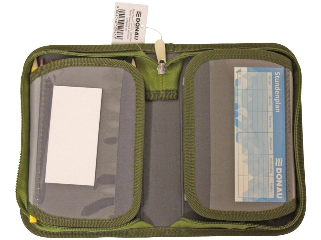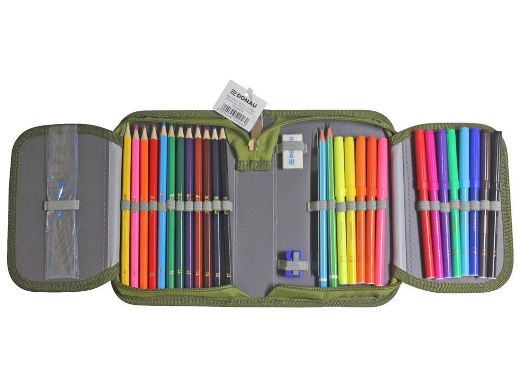 Plný 1-zipsový peračník, 2-chlopňový, 6 rôznych farieb (olivová, modro-červená, tyrkysová, zeleno-modrá, čierno-oranžová, sivo-ružová), 32 kusov (obsah: 1 rozvrh hodín, 1 poznámkový blok bez riadkov, 1 pravítko, 12 farebných ceruziek, 1 guma, 1 strúhadlo, 2 ceruzky, 13 fixiek), materiál polyester, ŠxVxH: 195x36x130mm, hmotnosť 330g.Dodatočné parametre