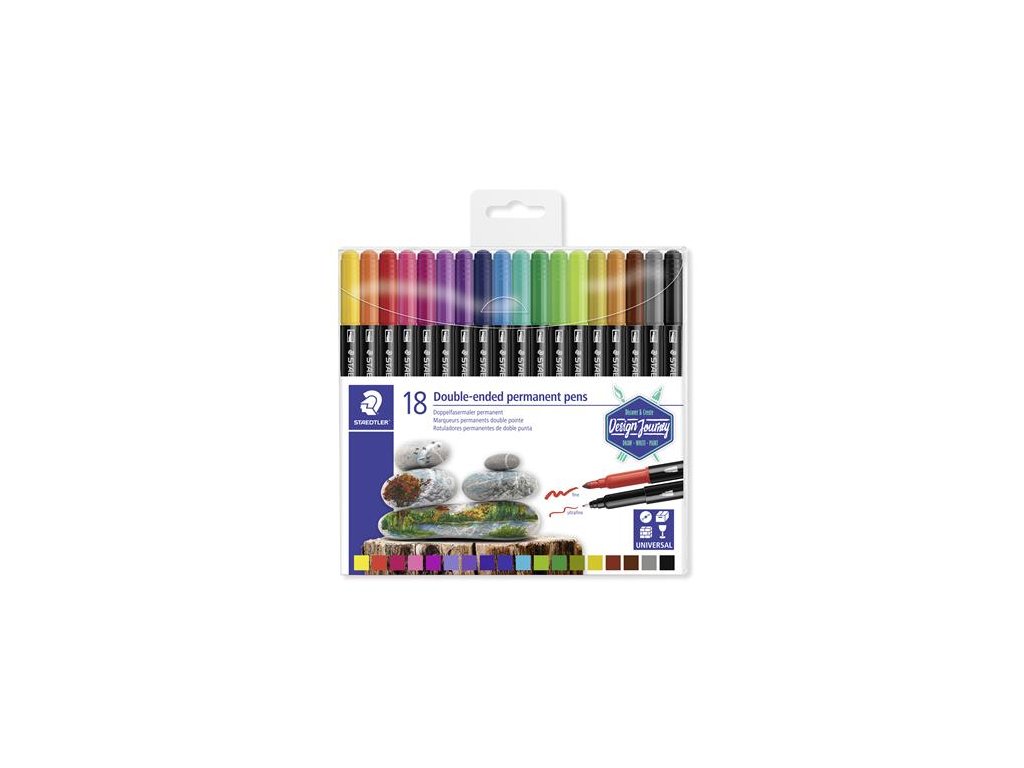 obojstranný permanentný popisovač vhodný na väčšinu povrchov nezanecháva škvrny, vodeodolný PP telo pera a uzáver pre dlhšiu životnosť 18 rôznych, intenzívnych, žiarivých farieb Značka: STAEDTLER Výrobca: STAEDTLER SE Adresa: Moosäckerstr. 3 , 90427 Nuremberg, Germany Web: http://www.staedtler.com Email: https://www.staedtler.com/intl/en/service/contact/Dodatočné parametre
